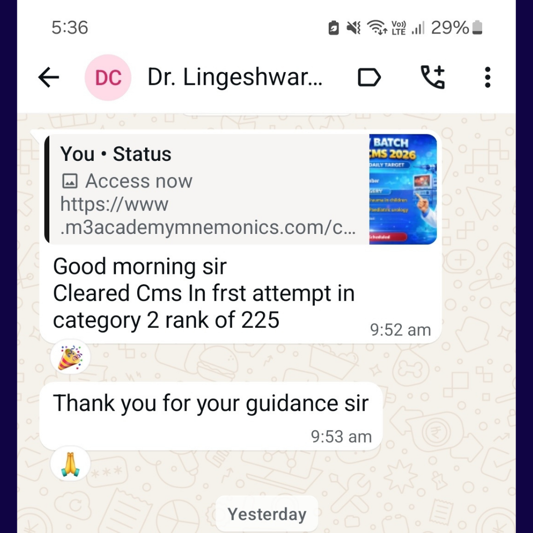 “Firstly, thank you so much — I cleared my MCI exam in July with the help of M3 Academy! 🙏🌍 I was one of the first subscribers last year when there were fewer mnemonics… and now the content has grown a lot. Congratulations to the whole team! 🎉🎉 Now I’m preparing for NEET PG and UPSC CMS and will be following your timetable during internship. Thank you again for this amazing platform!”