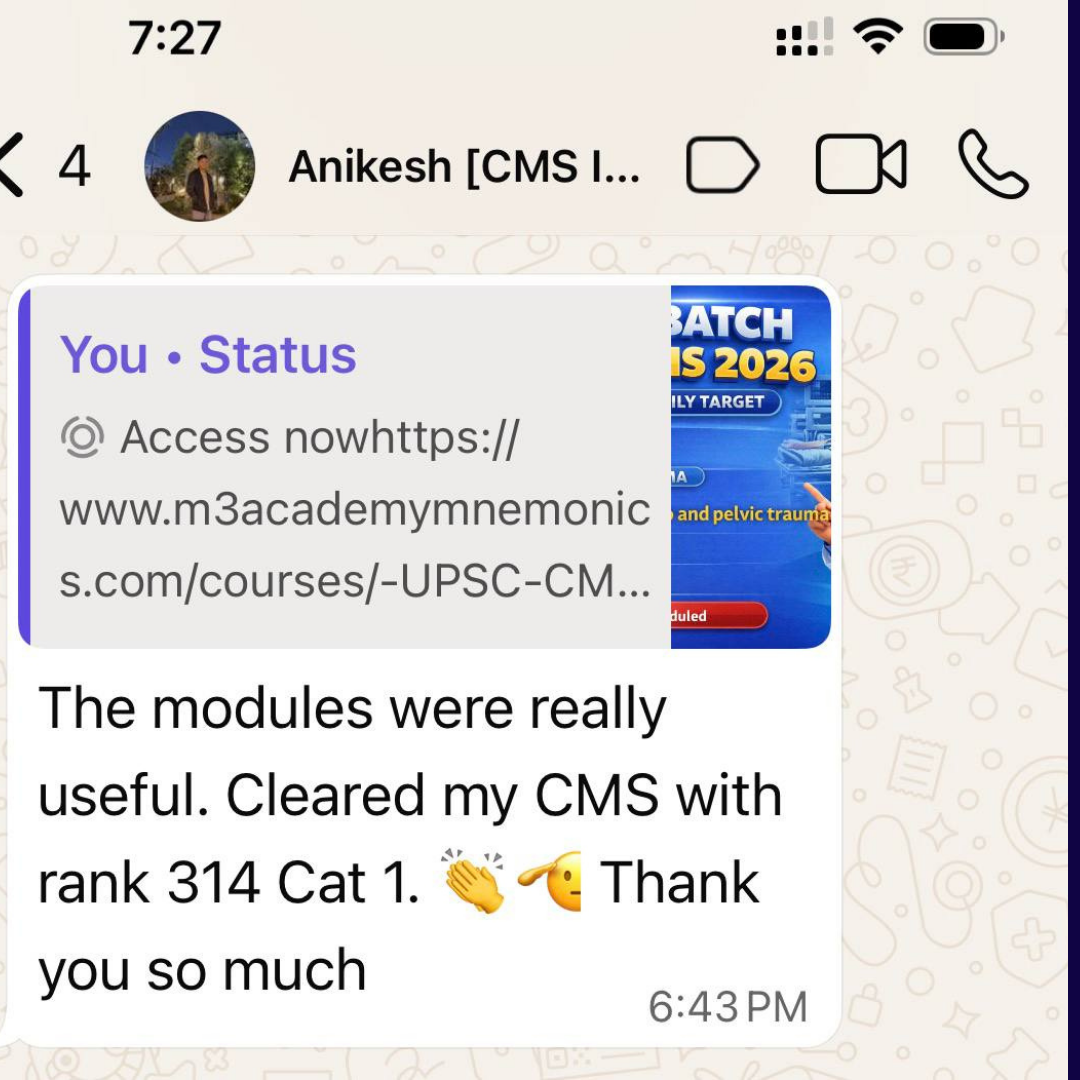 “M3 just made my NEET PG preparation so much easier! I could actually retain what I read for a longer time. The mnemonics and the way sir teaches — simply awesome! 💯 Grateful to the whole team for this incredible content. Another best part? Sir is always available, helping us in tough topics, and consistently creating new mnemonics to keep us on track. So thankful and motivated!”